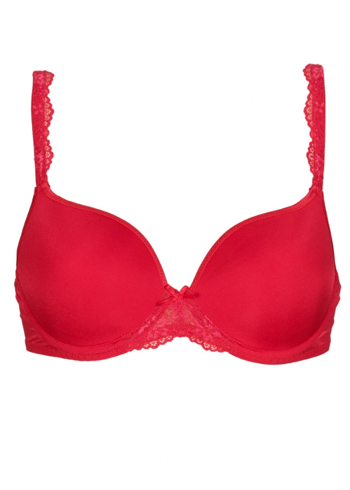 Daily Lace i röd är en färgstark och glädjefull serie underkläder med exklusiv spets. Detta är en röd T-shirt bh med slät kupa och en söt spets både på axelbanden och mellan kuporna.